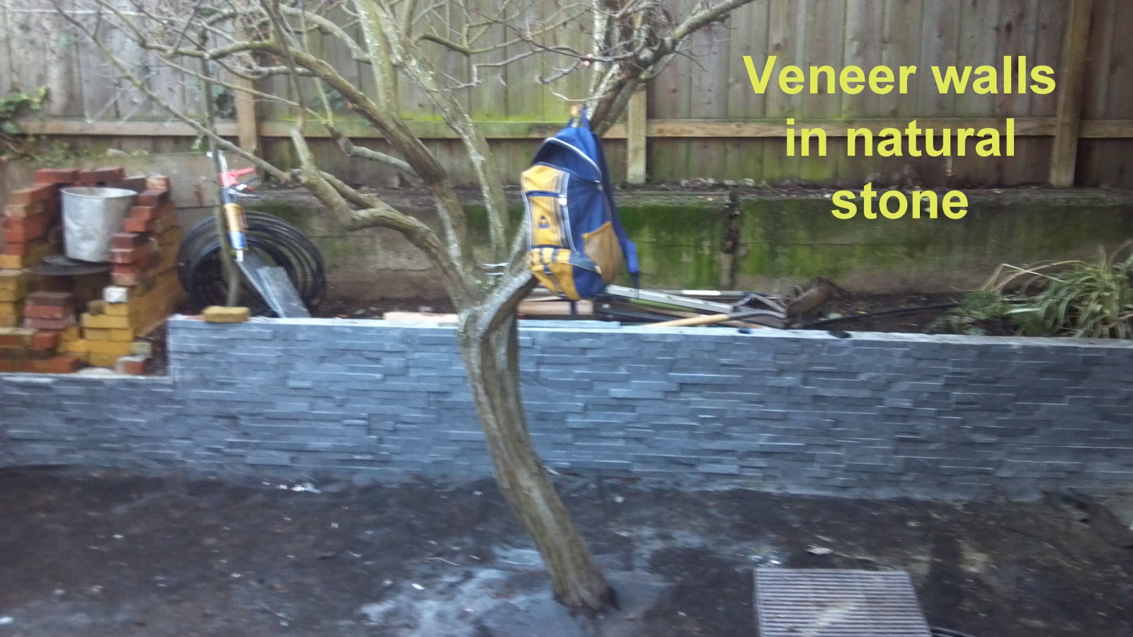 We began by clearing the space and regrading the sloping open area to create a open, level space. The existing cracked and wonky retaining walls were patched and squared up. The low end of the space was retained with a raised veggie and spice bed.