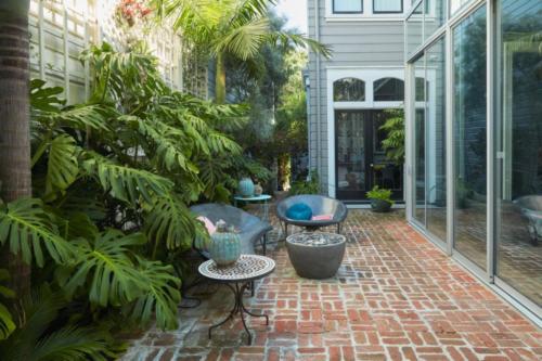 An 1880s home with many generations of additions over the decades left this garden feeling like a patchwork. The existing brick patio was expanded using reclaimed bricks. Dull wall to wall concrete pavement was removed for softening planting beds and a brick path for consistency and drainage where pooling and puddles and been a problem. The outdoor room effect was finished with king palms who trunks create architectural 'columns' and fronts suggest a ceiling.
