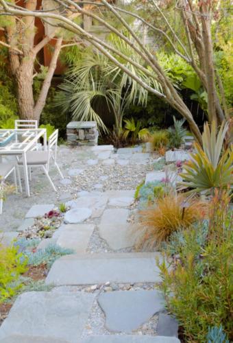 This deep lot was forgotten and overgrown. We had to literally bushwhack and push aside the dense undergrowth to get through it during or initial consultation with the homeowner. This sensation of exploration and discovery was the launching point for this design. 'Ruined' Neolithic hardscaping and dense jungle plantings maintain the adventure into an abandoned place that has long since been subsumed again by plants.